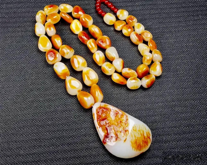 带皮色的和田籽料中,除了少量数玛丽艳红皮,大大批都是以淡色、洒金为主,聚色料尚且罕有,更况兼是艳压群芳的靓色。
