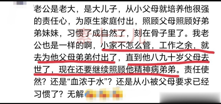 有网友拿自家例如,说老公是年老,公婆从小就培养年老为原生家庭付出,这种思法刻进试验里了,成了俗例。