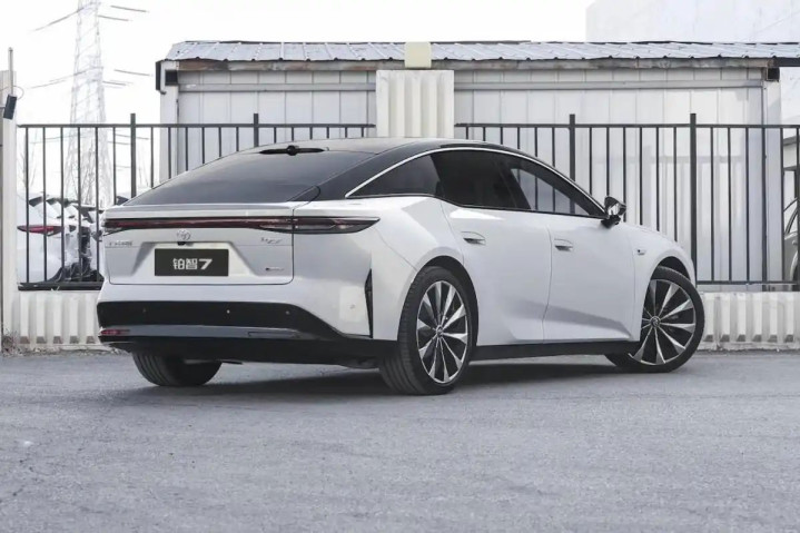 前保障杠中除了有小尺寸的梯形气孔外,也会提供稍许隆起的玄色前唇,它们会与光带、导流一说念酿成一定指挥倾向,让车头跟上了当下纯电轿车应有的前锋感。