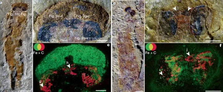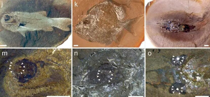 具体来说,他们在云南澄江化石地里发现了两种最迂腐的脊椎动弃世石:海口鱼和某种昆明鱼。这些唯一几厘米长的小生物生活在距今 5.18 亿年前的海洋中。通过高倍电子显微镜不雅察,辩论东说念主员在它们的头部发现了四个显着的玄色雀斑。