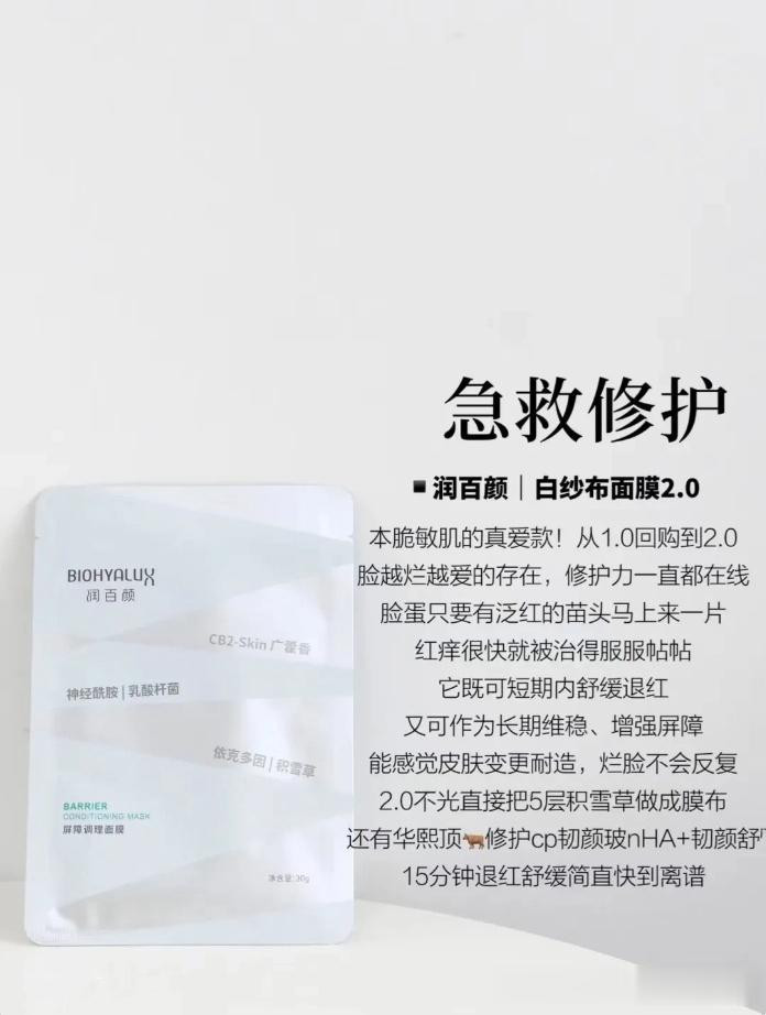 谁家告成把积雪草作念成膜布啊?也曾5层的,润百颜你可真牛。修护面膜里头个主打膜布+要素双修护,敏皮烂脸敷上那叫一个爽,纱布质量卓越透气柔滑,退红修护跟开了2倍速相似。