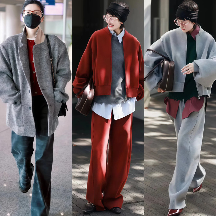 灰色穿多了,未免认为有点素,这本事咱们就不错加少许红色好像粉色,点亮造型。但记取,不要选正红色,太跳了,像砖红色、酒红色、脏粉色,这些带点灰调的红粉色,和灰色才是绝配。