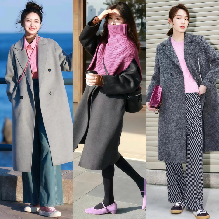 在搭配粉色内搭的本事,无谓露太多,领口那一小截就够了,稍加点缀才最多礼。这种穿法比内搭选全身粉色要好得多,粉色仅仅一个点缀,有了灰色的压制,不会显得太甜腻。