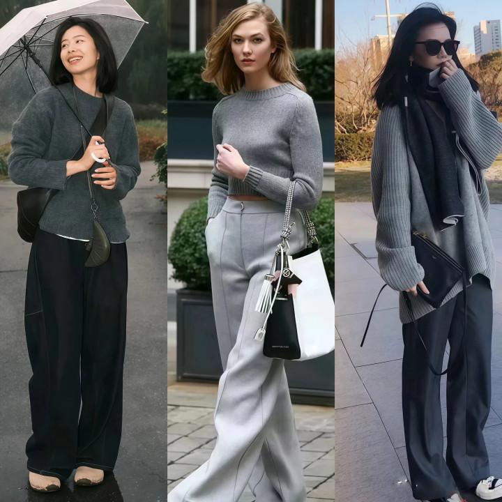 全身灰听起来有点难,但穿好了简直很排场,一个决窍:灰色要有深有浅,材质要有软有硬,比如下图博主穿的浅灰色毛衣+深灰色西装阔腿裤,多种灰色放在一谈,分手十分赫然。
