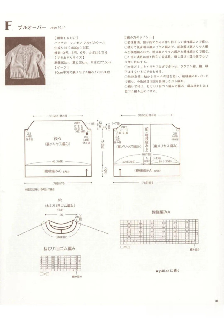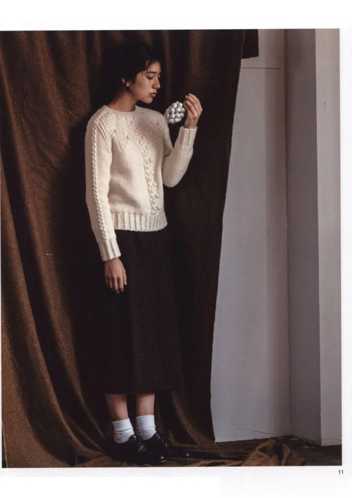 带有可生动退换的阿兰神志的细致套头衫。疏密有致的神志布局,使衣身看起来利落澄莹。袖口与下摆的长绳编蓄意,带来紧凑收束的印象。Yarn_ HAMANAKA SONOMONO 羊驼毛Design_ SaichikaKnitting_ 松本纪子