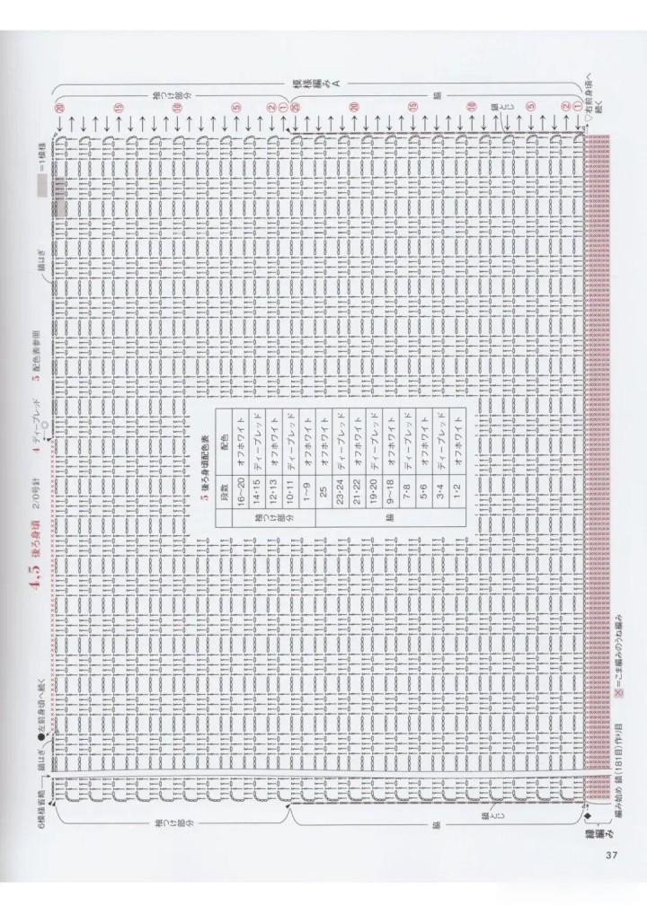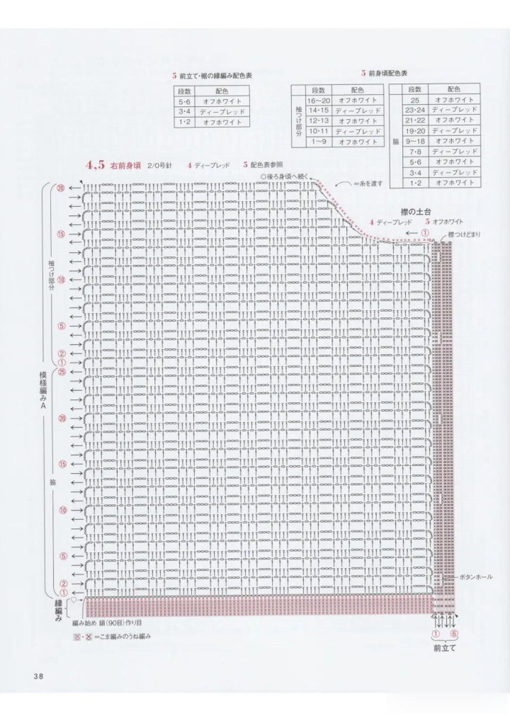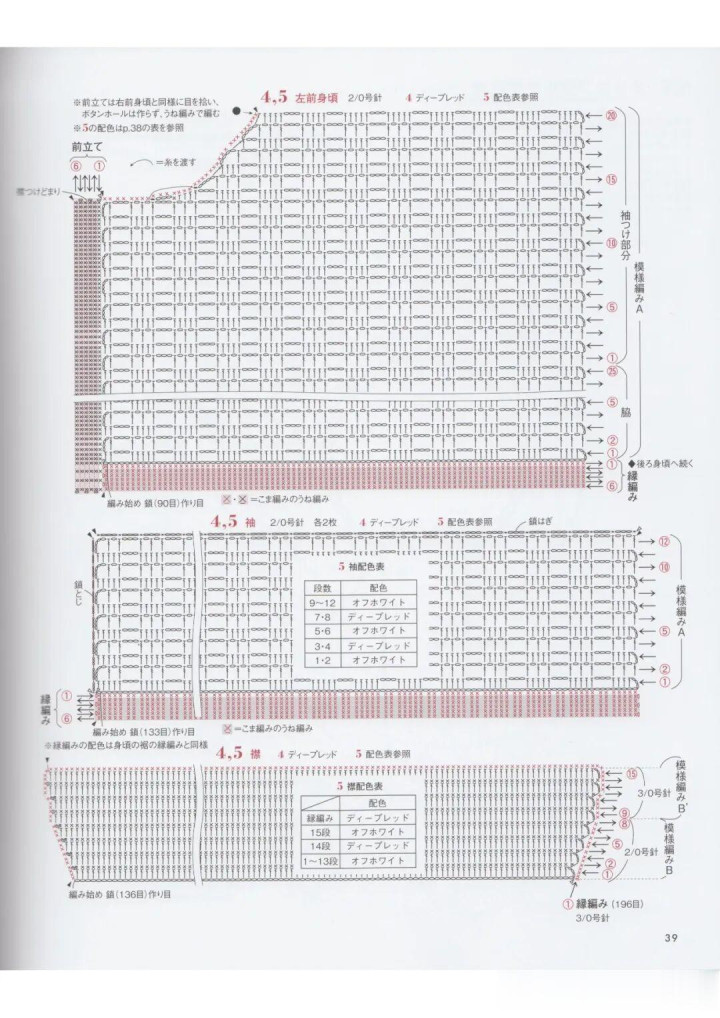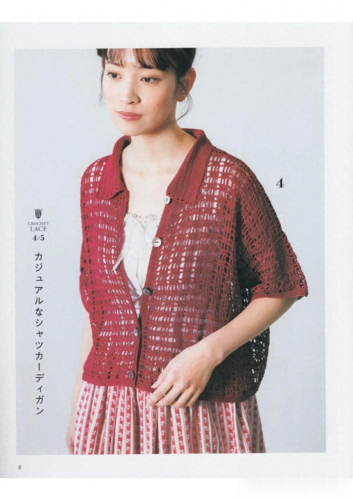 :中枢是方眼网格(技俩 A/B),分色段染(5 号款)或纯色(4 号款)肌理涌现;翻领 + 纽扣孔是造型亮点,中阶钩针友好。