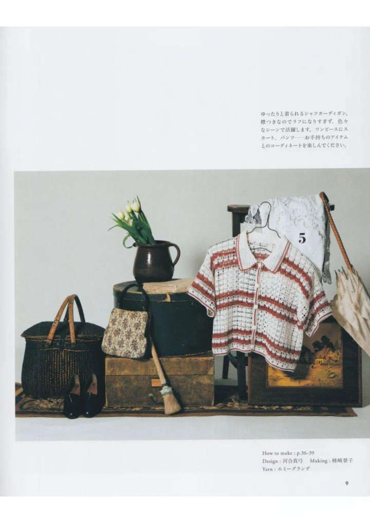 这款河合真弓磋磨的钩针方眼网格开衫,以酒红纯色 / 米白撞色钩就通透肌理,翻领 + 单排扣显守旧和蔼圭表风