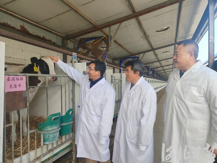 2025年12月20日,韩建永(左)、刘红波(中)、李树静(右)检察世界首批胚胎干细胞基因裁剪克隆牛发育情况。河北日报记者王璐丹摄