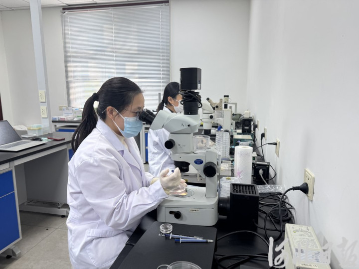 2025年12月29日,天泉公司实验室,技巧东说念主员正用显微镜筛选胚胎。显微镜下,桑葚状的胚胎在培养液中静静悬浮。