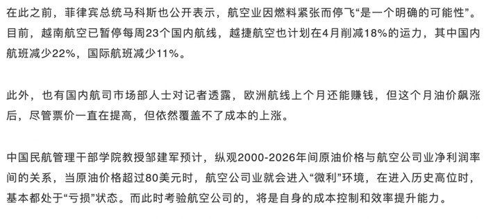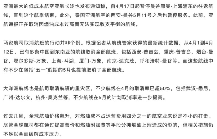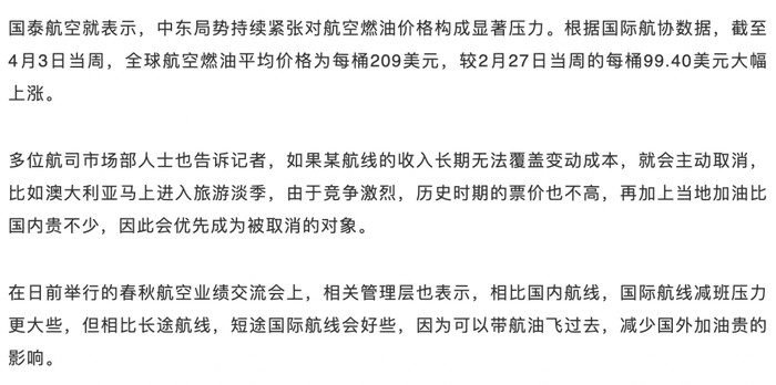 记者从多家航空公司获悉,从4月运行主动取消的航班照实有所加多,其中东南亚和大洋洲是重头,这与油价的大幅高涨不无联系。比较国内,部分海外机场加油价钱更高,重叠需乞降竞争的影响,部分航路的取消就首当其冲。