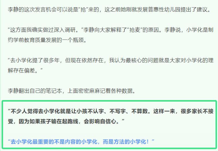 西南大学培植学部李静院长在政协会议分组揣摸中默示:“去小学化最攻击的,不是本色的小学化,而是时间的小学化。”