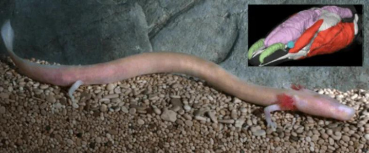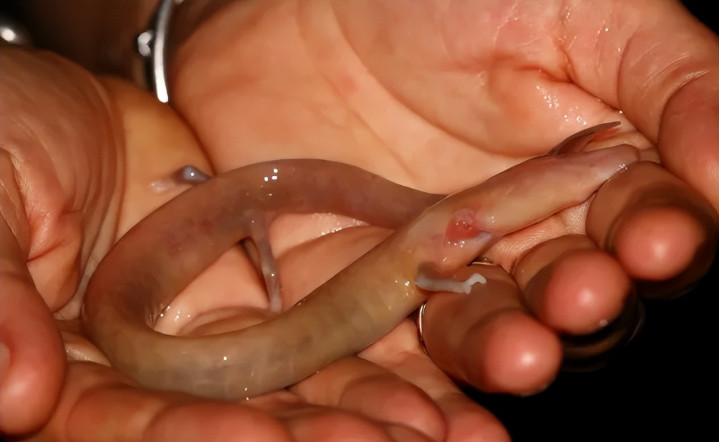 再仔细的态状一下洞螈的解刨学特征,它们的体长为20~40厘米,躯干相比顺耳,粗细很均匀,蒙胧可见肌节交壤处有轨则胪列的沟槽,就像分节了一样。