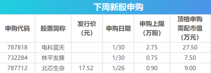Wind数据暴露,下周将有3只新股刊行。具体来看,1月26日刊行的是北芯生命,1月30日刊行的是林平发展、电科蓝天。