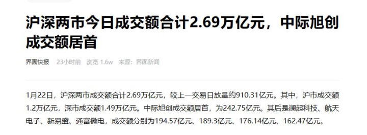 {jz:field.toptypename/}再看散户资金的情况,22号沪深两市成交额再次大肆2.7万亿,比较21号还有所放量。这样的量能足以撑持市集保持一定活跃度,唯有板块逻辑过硬,资金就能借着这份量能趁势炒作。