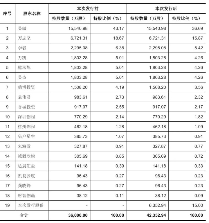 IPO后,吴敏抓股为36.69%,万志坚抓股为15.87%,李毅抓股为5.42%,万凯、熊承思、吴杰分辩抓股为4.26%,瑞博投资抓股为3.56%,袁伟君抓股为2.32%,香城投资抓股为2.17%;