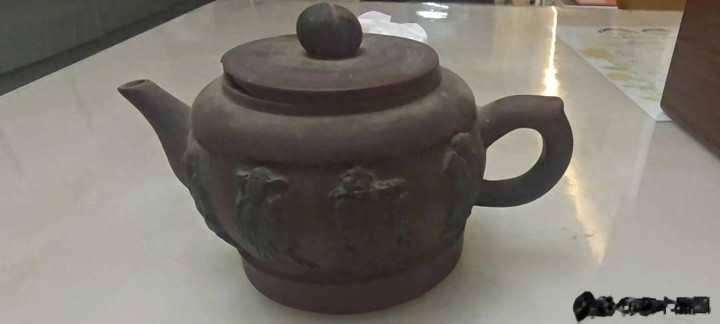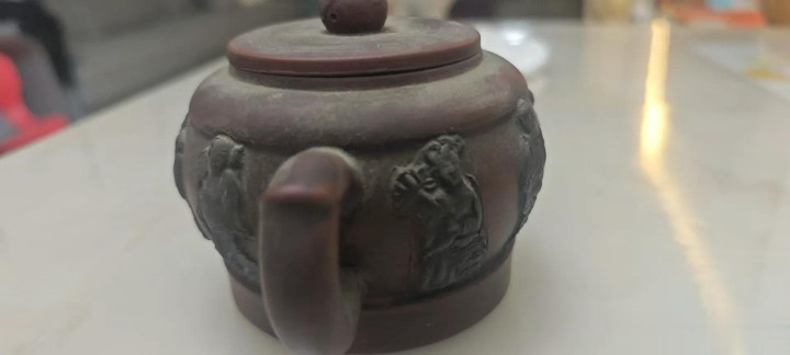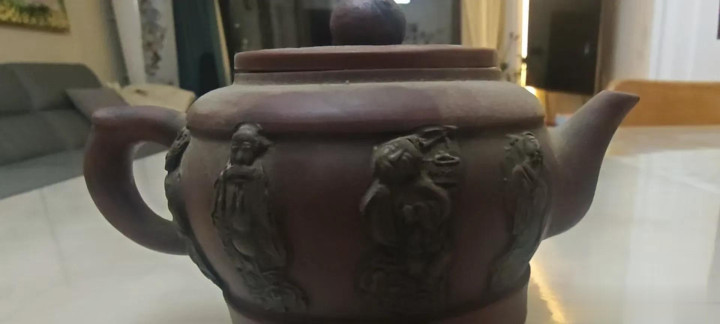 这件紫砂壶最具特质之处,莫过于壶身的遮挡工艺——堆塑八仙纹。堆塑是民间紫砂遮挡中颇为常见的手法,又称“塑贴”“堆花”,需匠东说念主以泥料为笔,将图案层层堆叠于壶身,再经砥砺修饰而成,相较于刻绘、彩绘,更具立体感与端倪感。此壶之上,八仙东说念主物造型虽从简,却形神兼备,各有姿态。铁拐李的手杖、汉钟离的葵扇、吕洞宾的宝剑、何仙姑的荷花、蓝采和的花篮、韩湘子的横笛、曹国舅的玉板、张果老的渔饱读,这些记号性的器物与东说念主物心思被匠东说念主精巧捕捉,虽线条粗莽,却拙趣盎然。衣纹褶皱当然指令,东说念主物排布疏密有致,堆塑的端倪贯通分明,八仙仿佛自壶身款款走出,历历如绘。这种遮挡格调,莫得宫廷紫砂的繁复丽都,却带着民间艺术的质朴正直,将“八仙过海,各显其能”的安靖寓意融入壶身,既幽闲了庶民对好意思好活命的向往,又为这件实用器用增添了浓郁的文化气味。