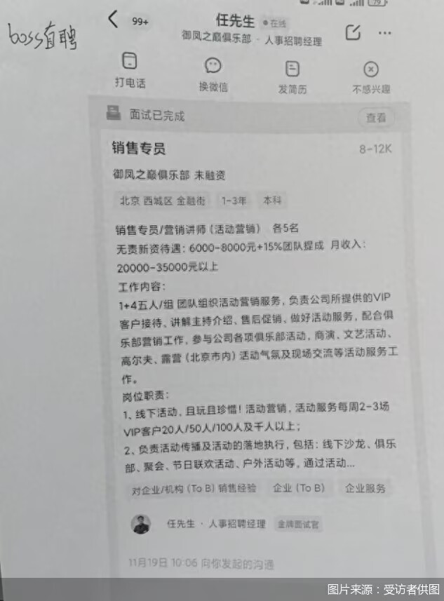 2023年11月,正在BOSS直聘平台寻找使命的王立,被一则来自御凤之巅俱乐部处罚处事(北京)有限公司的招聘信息眩惑。