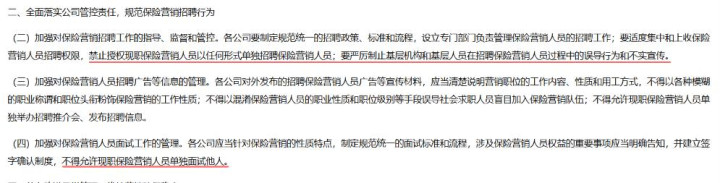 根据原保监会2009年发布的《对于加强和完善保障营销员处罚使命连络事项的告知》,各公司要制定例范颐养的招聘计策、圭臬和经由,成立成心部门负责处罚保障营销东说念主员的招聘使命;要甘休纠合庸上收保障营销东说念主员招聘权限,不容授权现职保障营销东说念主员以任何格式单独招聘保障营销东说念主员;要严厉制止下层机构和下层东说念主员在招聘保障营销东说念主员过程中的误导行径和乌有宣传。