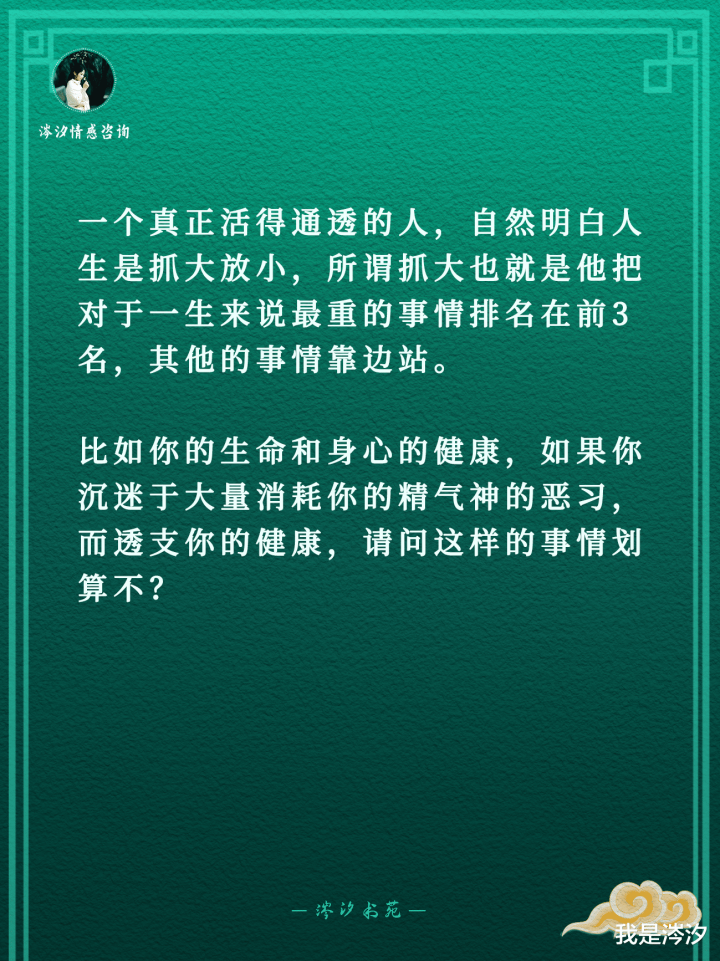 一个信得过活得通透的东说念主,当然赫然东说念主生是抓大放小,所谓抓大也便是他把关于一世来说最重的事情名次在前3名,其他的事情靠边站。比如你的人命和身心的健康,要是你千里迷于无数破钞你的精气神的恶习,而透支你的健康,教唆这么的事情合算不?