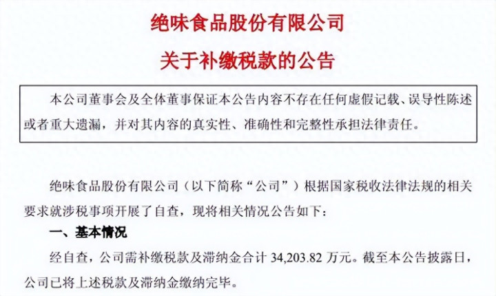 4月4日,绝味食物(股票简称:ST绝味)发布了一则畏惧本钱阛阓的公告:经税务自查,公司需补缴税款及滞纳金筹算3.42亿元,且联系款项已全额交纳。这笔广大补缴,如团结颗深水炸弹,透顶引爆了这家“鸭脖之王”连年来积存的功绩与信任双重危急。