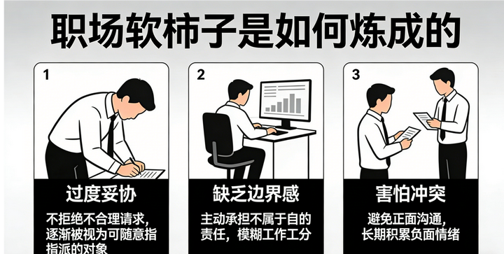 其实,成为职场“软柿子”的中枢逻辑惟有一个: