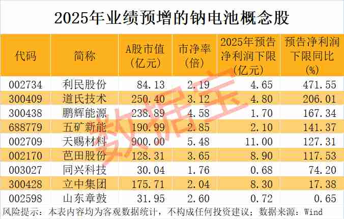从最新公布的功绩数据来看,按照预报净利润下限诡计(无下限则取公告数值),2025年净利润同比增长(含扭亏为盈)的钠电板观念股有9只,包括利民股份、谈氏技巧、鹏辉动力、五矿新能、天赐材料等。