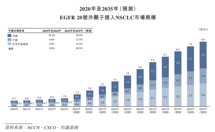 环球EGFR20番外显子插入突变NSCLC市集范围由2020年的7亿好意思元增至2024年的10亿好意思元,年复合增长率为9.0%,瞻望2035年将增至80亿好意思元,2024年至2035年的年复合增长率为20.5%。