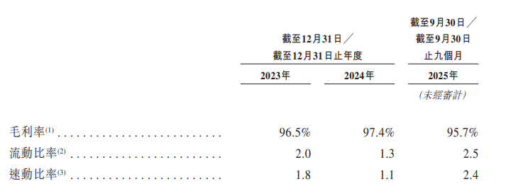 于2023年度、2024年度、2025年收尾9月30日止九个月,该公司毛利率鉴识约为96.5%、97.4%、95.7%。