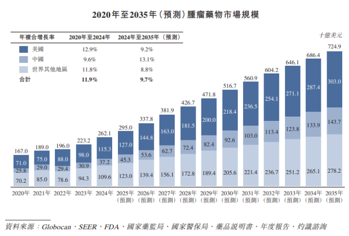 {jz:field.toptypename/}确认灼识商议的府上,环球肿瘤调整药物市集范围由2020年的1,670亿好意思元增至2024年的2,621亿好意思元,年复合增长率为11.9%,瞻望2035年将达到7,249亿好意思元,2024年至2035年的年复合增长率为9.7%。在中国,市集范围由2020年的258亿好意思元增至2024年的372亿好意思元,瞻望到2035年将达到1,437亿好意思元,2024年至2035年的年复合增长率为13.1%。