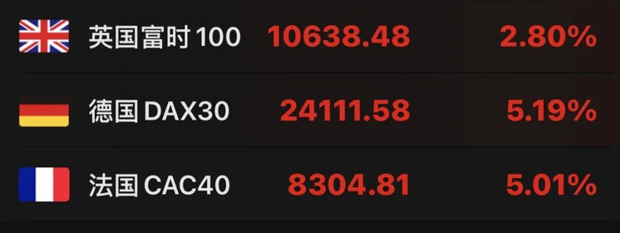 欧股方面,欧洲斯托克50指数涨5.37%,报5935.7点;英国富时100指数涨2.80%,报10638.48点;法国CAC40指数涨5.01%,报8304.81点;德国DAX30指数涨5.19%,报24111.58点;富时意大利MIB指数涨4.12%,报47282.25点。